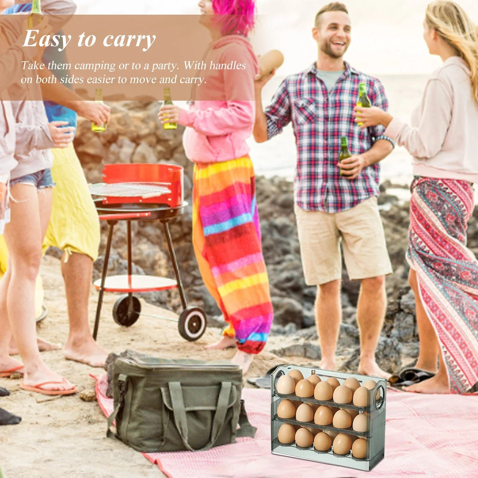 Acest recipient pentru oua de la frigider poate fi plasat pe raftul frigiderului, usa frigiderului, blatul din bucatarie sau le puteti duce la camping sau la petreceri. Mânerele de pe ambele parti faciliteaza deplasarea si transportul.