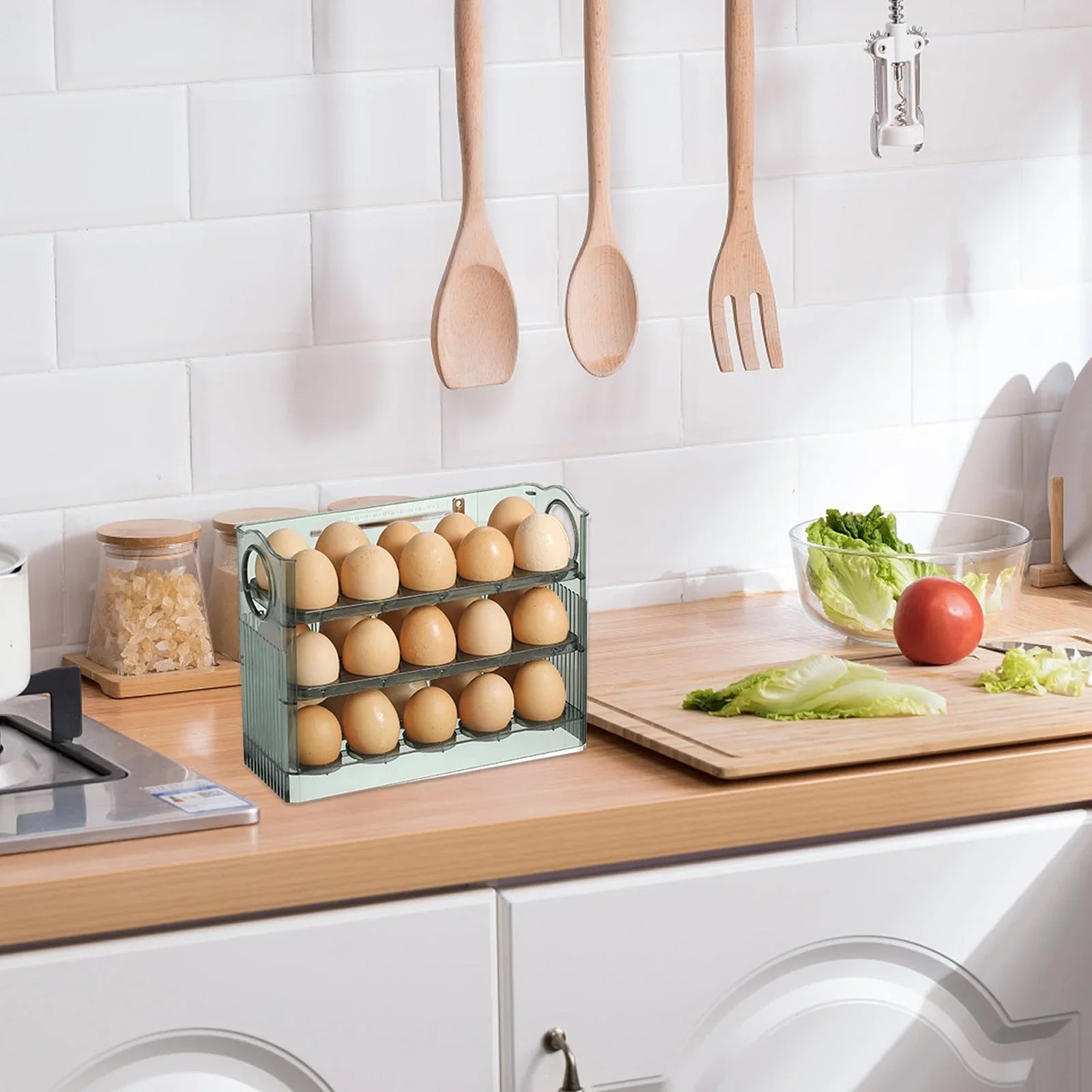 Cutie de depozitare pentru oua cu design cu 3 nivelei: tava pentru oua cu doua straturi de pe partea de sus a frigiderului poate fi rasturnata când fiecare strat este epuizat, facând mai usor sa luasi oua si sa le punesi. Punerea unui ou pe o grila permite ouale sa fie încarcate separat fara sa se ciocneasca unele de altele.